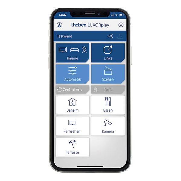 Die Visualisierung kommt ohne Displays aus. Ein Android- oder iOS-Smartphone genügt. Damit lädt sich der Anwender die kostenlose App LUXORplay herunter. Diese übernimmt bei der ersten Verbindung mit der Systemzentrale alle Bezeichnungen der Räume, Schalter usw. Die graphische Gestaltung ist vorgegeben, so dass die Visualisierung mit dem ersten Start einsatzbereit ist. Der Anwender kann nun Zustände von Lichtern, Jalousien, Rollläden, allgemeinen Einstellungen usw. visualisieren und verändern. Er kann z. B. jedem Aktorkanal ein Zeitprogramm zuweisen oder Szenen definieren.